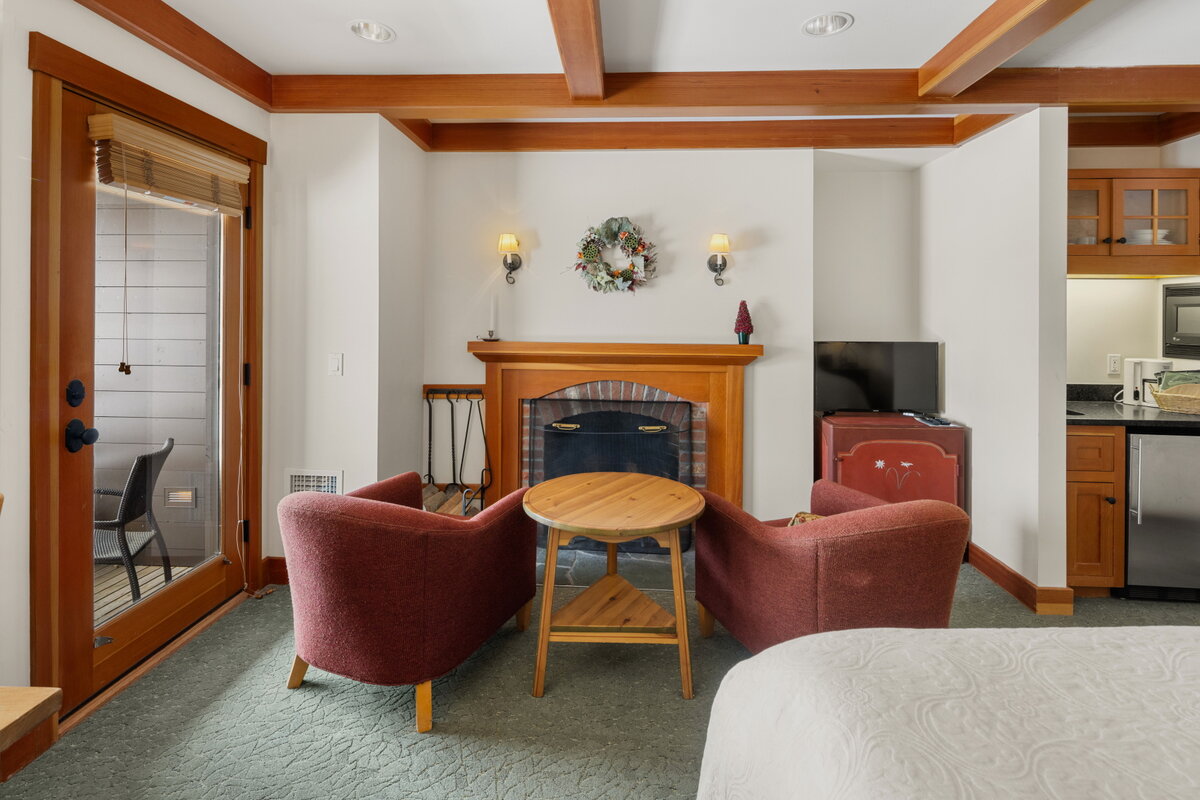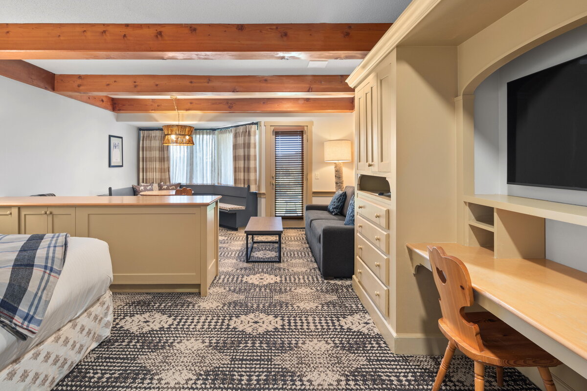 The Salzburg Suite features a king-size bed, sitting area with queen-size sleeper sofa, and large bathroom. This room also includes a refrigerator and patio with beautiful mountain views. This room cannot fit a rollaway bed.