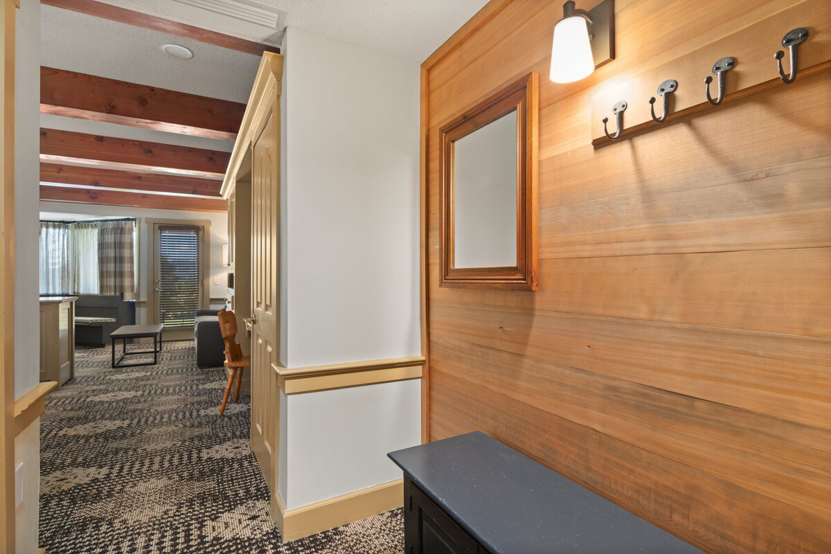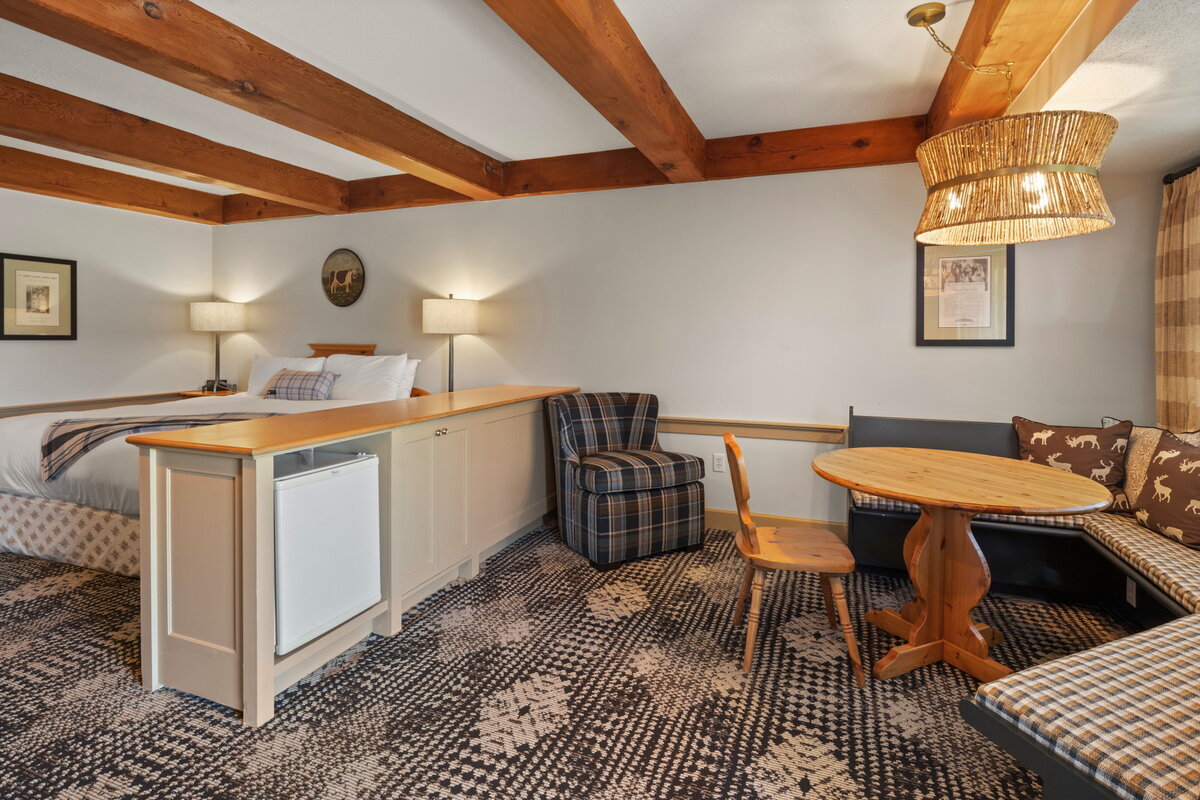 These large rooms are around 400 sq. ft., including one king-size bed and one queen-size sleeper sofa, and feature mountain views. These rooms require a small set of stairs to access and cannot fit a rollaway bed.