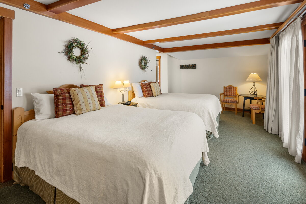 These beautiful rooms are around 400 sq. ft., including two queen-size beds, and feature mountain views. These rooms require a small set of stairs to access and cannot fit a rollaway bed.