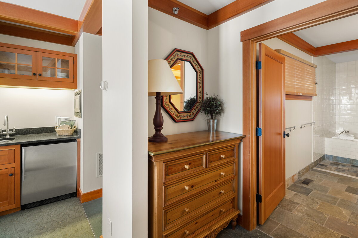 The Tyrol Suite features a king bed, sitting area with queen-size sleeper sofa, large bathroom, and balcony with orchard views. These suites also include a wet bar with refrigerator. Rollaway beds cannot fit in this room.